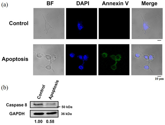 UV-induced apoptotic SH-SY5Y cells. (a) Immunofluorescent images for bright field (BF), nucleus staining (DAPI) and annexin V labeling of cells. (b) Western blot analysis for caspase 8 expression. The relative expression levels of proteins were quantified using Image J software. GAPDH levels were used as the internal loading control.