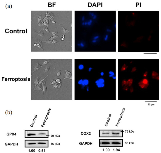 Sodium iodate-induced ferroptotic SH-SY5Y cells. (a) Immunofluorescent images for bright field (BF), nucleus staining (DAPI), and propidium iodide staining of cells. (b) Western blot analysis for GPX4 and COX2 expression. The relative expression levels of proteins were quantified using Image J software. GAPDH levels were used as the internal loading control.