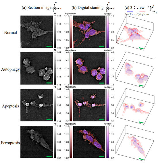 Representative RI image in the SH-SY5Y cell conditions of normal, autophagy, apoptosis, and ferroptosis. (a) Section images. (b) Digital staining. (c) 3D view of cell images. Scale bar (green): 10 m.