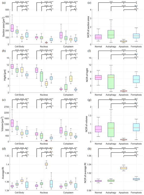 Box plot for quantitative analysis of physical parameters in different cell states. Red: normal cells; green: autophagic cells; yellow: apoptotic cells; blue: ferroptotic cells. The area, height, volume, and average RI were compared in different cell conditions (a–d), respectively. The NCR of these parameters were also shown in (e–h), as indicated. n.s.: not significant; *: p < 0.05; **: p < 0.01; ***: p < 0.001; ****: p < 0.0001.