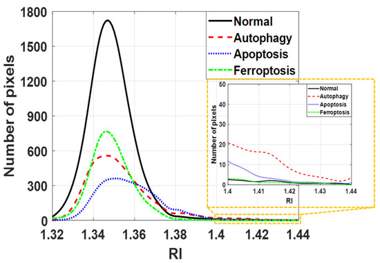 - For autophagic cells, most of the analytic parameter values ranked second highest after normal cells. The highest RI population belonged to the autophagic cells, as illustrated in the directly fitting plots of the RI histograms calculated from the section images in Figure 7. Due to the smaller number of highest RI regions, they were not significantly observed in the average RI value.