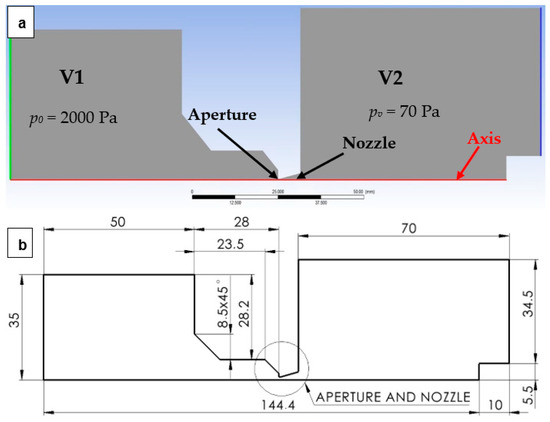 This entire research is conducted on the experimental chamber that simulates the state of flow between the specimen chamber (marked V1 in Figure 1a) and the differentially pumped chamber (marked V2 in Figure 1a) [24]. These chambers are separated by the aperture and nozzle (Figure 1b) in the experimental chamber. This part is designed in the experimental chamber as an exchangeable part.