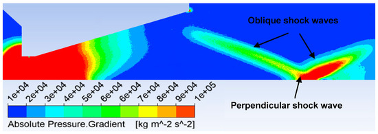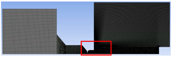 Figure 11a shows an increase in the area of the rectangular area (Figure 9—red box). The zoomed area shows the preplanned refinement. The refinement took place in places where oblique shock waves and perpendicular shock waves were formed [40].