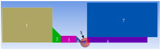 The basic mesh settings on which the calculation was based are shown in Figure 10. The computational area has been divided into the following areas to set each with a different mesh fineness and also to separate the areas that can be meshed with a structured mesh from the areas where triangles must be used. Each region has the following settings (Figure 10):