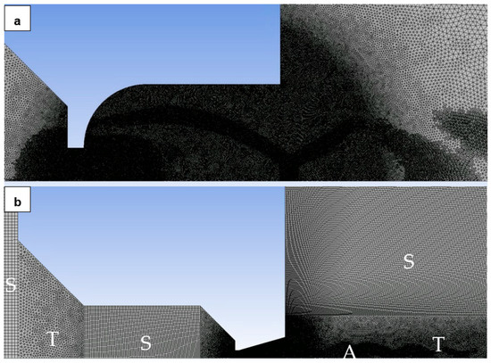 Figure 11b shows a mesh image zoomed to the most crucial point of the computation in the aperture and nozzle area. The combination of structured mesh in Figure 11b marked S is evident in this figure. The mesh formed by triangles is shown in Figure 11b as a T. The areas adapted to the mesh during the calculation are also noticeable in Figure 11b, labeled A.