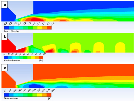 Mach number distribution (a), static pressure distribution (b), and static temperature distribution (c) of nozzle angle 18° variant.