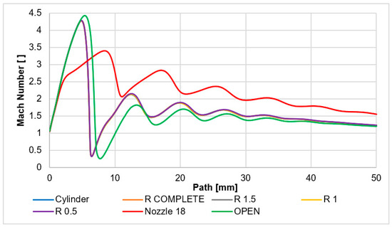 Mach number distribution of Nozzle Cylinder with R 1 mm variant.