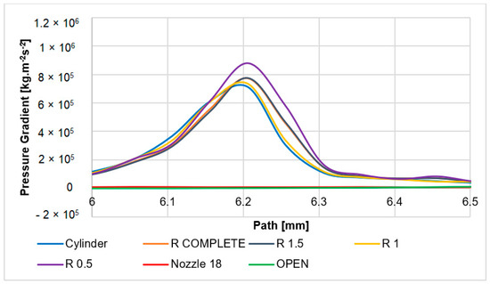 Pressure gradient distribution of Nozzle Cylinder with R 1.5 mm variant.
