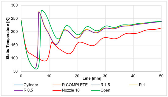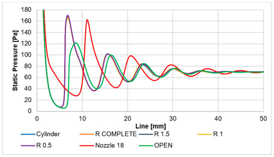 The results show that all cylinder-based variants have almost identical results. The rounding of the bottom of the cylinder does not affect the static pressure. The shape of the lower corner of the cylindrical nozzle does not affect the character of the gas outlet from the nozzle and, thus, the distribution of Mach number (Figure 12a), static pressure (Figure 12b), and temperature (Figure 12c). Distribution of Mach number, static pressure, and temperature for other variants are shown in the figures in Appendix A. The gas in this area has a minimum velocity and does not affect the main supersonic flow.