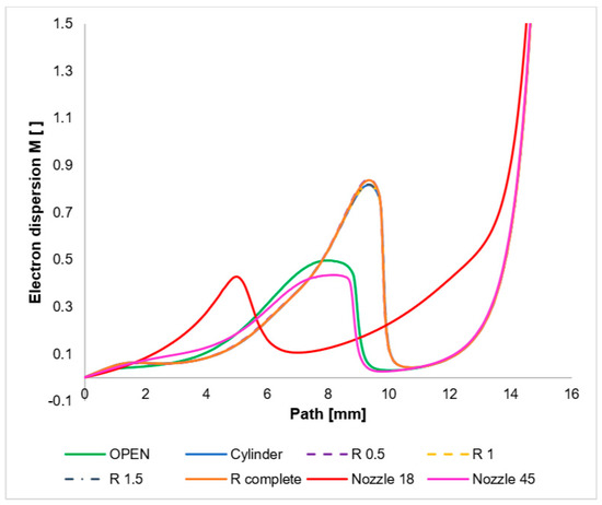 As mentioned above, this variant came out of the previous analyses [1] as the most advantageous for the passage of the primary electron beam when the nozzle was opened at 18°. This variant is compared in this article with variants different from the Laval nozzle and has an open lower part of the nozzle (Figure 2).