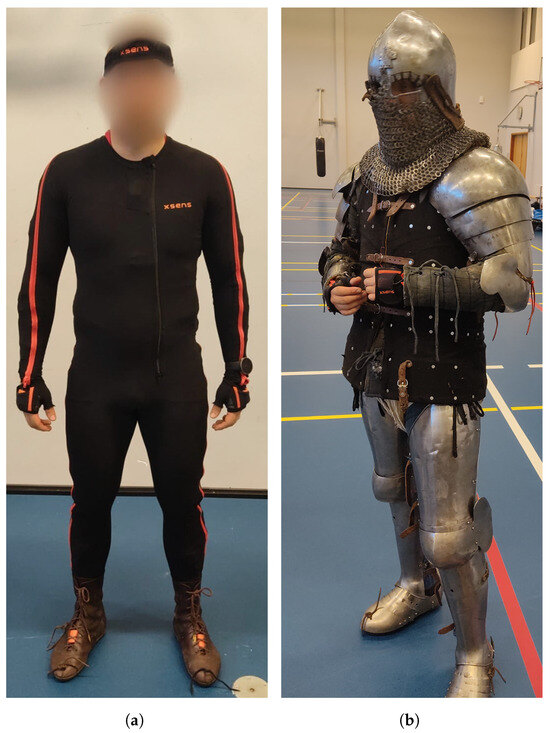 The XSENS MVN Link suit with 23 IMU sensors: (a) the combatant wearing the IMU suit; (b) the combatant in full armor on top of the IMU suit.