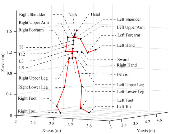Position of different XSENS MVN Link suit sensors—23 sensors are located in different places, each representing one body part, plus one extra sensor attached to the sword. The black dots indicate the locations of the sensors, and the red lines depict the connections between them. The blue line shows the extension that was used for the sword sensor.
