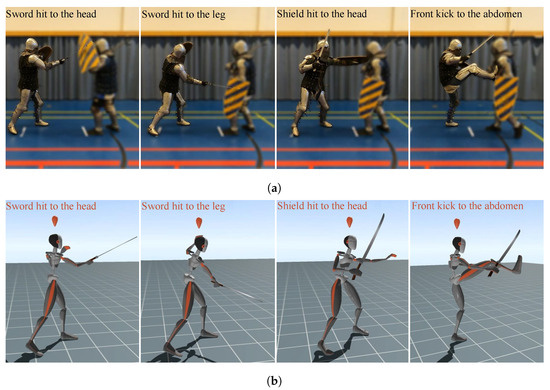 The drill for this experiment comprised four different strikes. (a) The execution of the drills in the real world. (b) The drill in the virtual world, provided by the XSENS software.