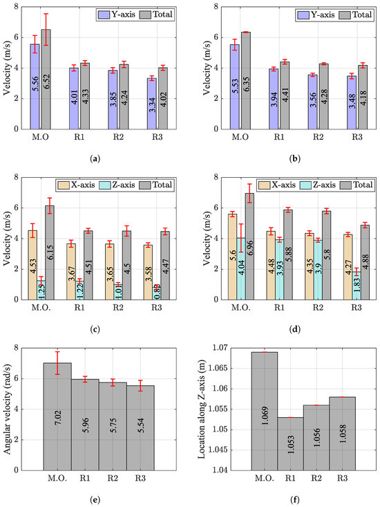 The change in the mean value of chosen kinematic variables during the pro-fight test for MO, R1, R2, and R3: (a) and for first strike; (b) and for the second strike; (c) , , and for the third strike; (d) , , and for the fourth strike; (e) for the fourth strike; (f) during the test.