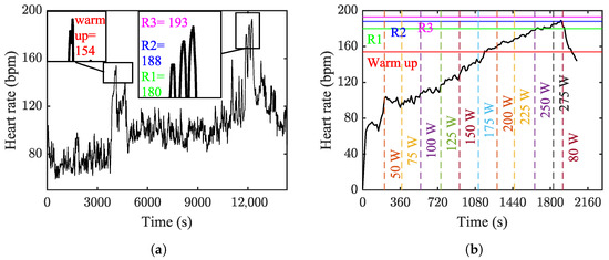 In the ergometer test, the increase in was gradual, closely mirroring the rise in workload (see Figure 6b). This gradual increase in continued until was reached at the workload of 275 W. At this point, with the initiation of the recovery phase, the heart rate began to decline.