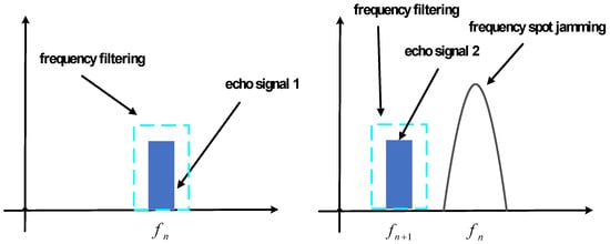 where represents the transmission power of the frequency-agile radar, and denotes the signal power of the frequency spot noise AM jamming. Assuming that the filtering can completely eliminate the jamming signal, equals 1 if , otherwise it equals 0. stands for the time–bandwidth product of the LFM signal.