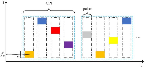 Figure 2 illustrates the schematic diagram of inter-pulse frequency agile radar with pseudo-random frequency hopping. Pseudo-random frequency hopping is an extremely flexible frequency hopping method, allowing the radar to transmit signals in other frequency bands to filter out targets and jamming signals when some frequency bands are covered by jammers.