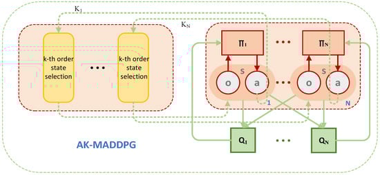 Given that the actions of jammers may be related to the radar’s historical actions, agents in multi-agent reinforcement learning may struggle to make correct decisions based solely on the previous observation. Therefore, this study improves the MADDPG algorithm by using an adaptive K-th order history method to enhance the input states, enabling them to contain the information necessary for radar decision-making. The improved AK-MADDPG algorithm’s schematic diagram is illustrated in Figure 5.