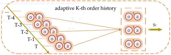The K-th order history method approximates historical states by considering the past K states approaching the current time. However, the crucial information required for agent decision-making may not necessarily be contained within these states, potentially resulting in suboptimal reinforcement learning outcomes for agents. To address this issue, we propose an adaptive K-th order history method. The principle of the adaptive K-th order history involves adding K actions related to K-th order history into the action space of the agent. The values of these actions determine which past states should be aggregated when approximating history. For instance, as illustrated in Figure 6, at time T, when K = 3, the values of these actions are [0, 2, 4]. Consequently, the observation and action at times T, T-2, and T-4 are combined, rather than simply considering the three adjacent observations and actions at the current time. Through the reinforcement learning process, the agent gradually learns to select the optimal K past states to approximate historical states. This indicates that as the reinforcement learning process progresses, will incorporate more information essential for the agents. It functions akin to a self-attention mechanism, allowing the agent to focus on important information while being resource-efficient and simple to implement.