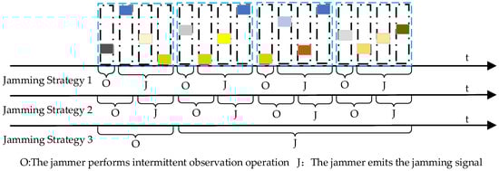 To validate the effectiveness of the proposed method, we assume that the jammer can adopt three different jamming strategies. As depicted in Figure 7, the distinctions among the three jamming strategies primarily lie in the duration of intermittent observation and the timing of emitting jamming signals. It should be noted that these three strategies belong to basic strategies; the jammer can achieve more complex strategies by dynamically adjusting different jamming strategies over a long game time. The descriptions of the three basic jamming strategies are as follows: