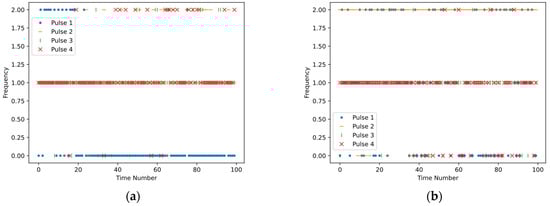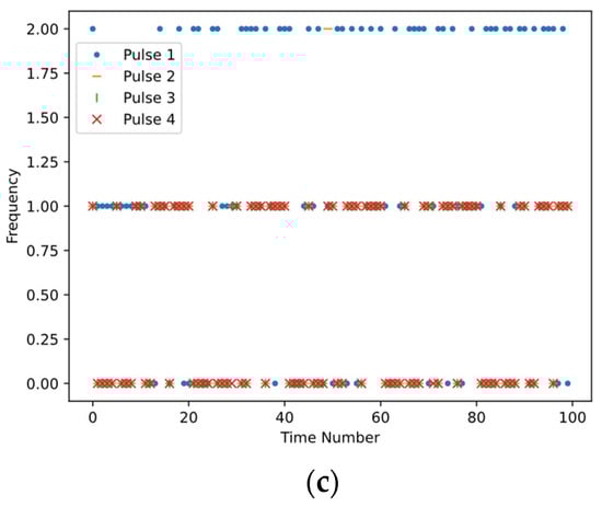 The antijamming strategies learned by the method proposed in this paper against the three jamming strategies are shown in Figure 9. The x-axis represents time, while the y-axis represents the carrier frequency of the pulses. As shown in Figure 9a, most of the frequencies of pulse 1 are . Since pulse 1 is intercepted by the jammer, other pulses will avoid and mostly concentrate around . Similarly, in Figure 9b, most of the frequencies of pulse 2 are , and other pulses avoid the frequencies of pulse 2, mostly concentrating around . As pulse 1 serves as a deceptive pulse and contributes nothing to coherent accumulation, the carrier frequencies are evenly distributed among the three frequencies. In Figure 9c, to counteract Jamming Strategy 3, the carrier frequencies of pulses 2, 3, and 4 tend to be consistent, alternating between and .