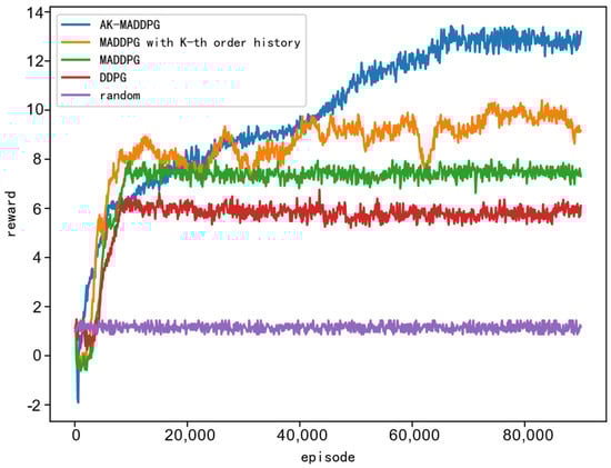 Figure 10 displays the reward curves under the scenario of complex unknown jamming strategies, based on the method proposed in this paper and four other methods. The x-axis represents the number of training epochs, while the y-axis represents the total reward obtained within a single training epoch. From Figure 10, it can be observed that the performance of the random frequency hopping method remains the poorest. The performance of multi-agent reinforcement learning methods surpasses that of single-agent reinforcement learning methods. Moreover, the performance of the method proposed in this paper is significantly better than that of the methods based on MADDPG with K-th order history and MADDPG alone. This indicates the clear advantage of the AK-MADDPG algorithm proposed in this paper when facing scenarios with complex unknown jamming strategies.