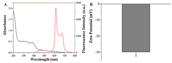 (A) The fluorescence emission spectra (red line) and UV-Vis adsorption spectra (black line) of Fe NCs. (B) Zeta potential measurement of Fe NCs solutions.