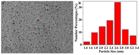 (A) TEM images of Fe NCs. (B) The particle size statistics histogram of Fe NCs.