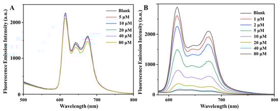 The fluorescence emission spectra of Fe NCs incubated with different concentrations of (A) potassium dichromate or (B) hydrogen peroxide for 10 min.