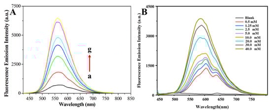 (A) The fluorescence emission spectra of OPD-H2O2-Fe NCs system. OPD: 40 mM, H2O2: 10 μM, Fe NCs: 1 μg·mL−1 (a), 2.5 μg·mL−1 (b), 5 μg·mL−1 (c), 7.5 μg·mL−1 (d), 10 μg·mL−1 (e), 20 μg·mL−1 (f), and 40 μg·mL−1 (g). Incubation time was 30 min. (B) The fluorescence emission spectra of OPD-H2O2-Fe NCs system. H2O2: 10 μM, Fe NCs: 7.5 μg·mL−1, OPD: 0 mM, 0.5 mM, 1.25 mM, 2.5 mM, 5.0 mM, 10.0 mM, 20.0 mM, 30.0 mM, and 40.0 mM. Incubation time was 30 min. All the operations were performed at 25 °C.