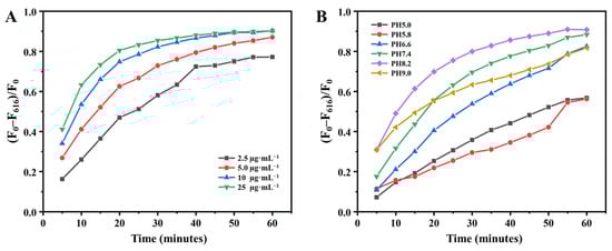 (A) The fluorescence intensity changes of Fe NCs solution incubated with 100 µM glucose and different concentrations of GluOx (2.5, 5.0, 10, 25 µg·mL−1) at different reaction times (pH 7.4, 100 mM PBS). (B) The fluorescence intensity changes of Fe NCs solution incubated with 100 µM glucose and 10 µg·mL−1 of GluOx in different pH environments at different reaction time (100 mM PBS). All the operations were performed at 25 °C.