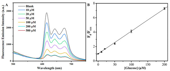 The fluorescent changes in Fe NCs and the GluOx system’s response to various glucose concentrations were illustrated in Figure 6. It can be observed that with the rising in glucose concentration, the fluorescence emission peak around 616 nm decreases gradually. As shown in Figure 6B, the relationship between the fluorescence intensity at 616 nm and glucose concentrations in the range of 0–200 μM can be well-described in the following equation: