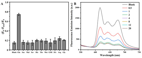 F0 is the initial fluorescence intensity at 616 nm of Fe NCs, while F616 indicates the fluorescence intensity at 616 nm of Fe NCs after incubation with 10 µg·mL−1 of GluOx and various concentrations of glucose. The detection limit for glucose was 1.6 μM, and the fitting coefficient was 0.999. In order to test the selectivity of this method for glucose detection, we investigated the fluorescent response of the Fe NCs–GluOx system to a series of biomolecules (100 μM), including glucose (Glu), sucrose (Suc), maltose (Mal), serine (Ser), His, threonine (Thr), methionine (Met), glutathione (GSH), dopamine (DA), arginine (Arg), and glycine (Gly). Figure 7A shows that only glucose could significantly quench the fluorescence of the detection system, demonstrating the well-selectivity of this method for glucose.