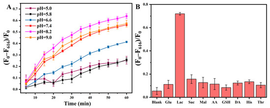 (A) The fluorescence intensity changes of Fe NCs solution incubated with 50 µM lactic acid and 2 µg·mL−1 of LacOx in different pH environments at different reaction times (100 mM PBS). (B) The fluorescence intensity changes of Fe NCs and the LacOx system incubated with 100 μM different additional biomolecules, respectively, for 60 min. Fe NCs: 100 μg·mL−1, LacOx: 2 µg·mL−1, pH environments: 7.4.