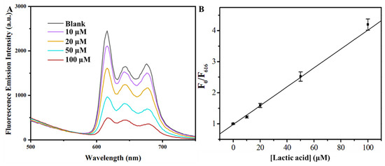 (A) The fluorescence emission spectra of Fe NCs solution incubated with 2 µg·mL−1 of LacOx, and different concentrations of lactic acid for 60 min (pH 7.4, 100 mM PBS). (B) The linear relationship between F0/F616 and lactic acid concentrations. All the operations were performed at 25 °C.