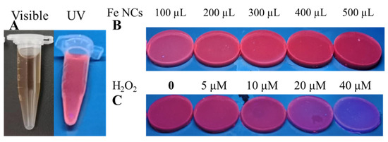 (A) Photo of Fe NCs solution under visible light and UV light. (B) Photo of agarose gel discs prepared with various volumes of Fe NCs solution (1 mg·mL−1) under UV light. (C) Photo of agarose gel discs based on Fe NCs immersed in H2O2 solution with various concentrations for 30 min under UV light.