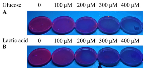 In order to utilize the detection system for glucose or lactic acid conveniently, we tried to make it into an agarose gel disc. As shown in Figure 10A, the Fe NCs solution exhibited bright red fluorescence under UV light. We injected various volumes of Fe NCs solution (1 mg·mL−1) directly into the hot agarose solution. After cooling to room temperature naturally, the agarose gel disc based on Fe NCs can be obtained. Figure 10B indicates that the series of agarose gel disc containing various amounts of Fe NCs can exhibit red fluorescence under UV light. Therefore, we chose 400 µL of Fe NCs to prepare the agarose gel disc. The prepared agarose gel discs containing Fe NCs were placed on the plastic plate, and 200 µL of different concentrations of H2O2 solution (0–40 µM) were injected into these agarose gel discs, respectively. After 30 min of incubation, the color changes of the agarose gel discs were observed by a dark-box ultraviolet analyzer upon 365 nm irradiation. Figure 10C offered the photo of their color changes, and it can be seen that the agarose gel disc changed from red to violet along with the increase in H2O2 concentrations from 0 to 40 μM. The above results demonstrated feasibility of the agarose gel based on Fe NCs for detecting H2O2. We further tested the performance of the agarose gel based on Fe NCs and GluOx/LacOx for the visual detection of glucose and lactic acid. As described in Section 2.6 and Section 2.7, we, respectively, prepared agarose gel discs combining Fe NCs and GluOx or LacOx. Figure 11A showed that the agarose gel discs comprising Fe NCs and GluOx can change from red to violet after incubating them with the increasing glucose concentration from 0 to 400 μM under UV light. Similarly, the agarose gel discs comprising Fe NCs and LacOx also changed from red to violet after incubating with the increasing lactic acid concentration from 0 to 400 μM. The above results demonstrated the Fe NCs and the GluOx or LacOx system can be successfully made into an agarose gel disc for convenient detection of glucose or lactic acid.