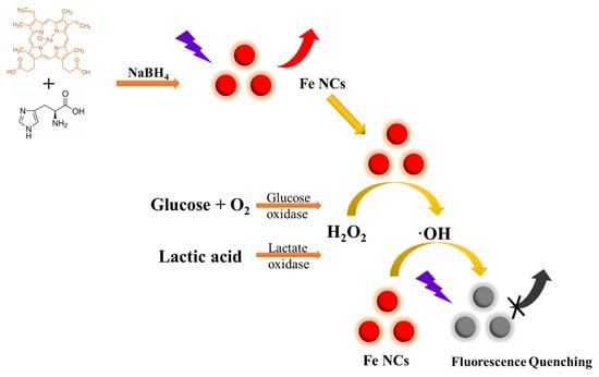 Fluorescent iron nanoclusters (Fe NCs), as an emerging fluorescent nanomaterial, display ultra-small size, well water solubility, and excellent antibacterial activity. In previous studies, we reported red-emitting Fe NCs with hemin as the main raw material, which displayed a broad spectrum of activity against Gram-positive bacteria [31]. Herein, we demonstrated the more sensitive response of fluorescent Fe NCs to external H2O2 concentration than potassium dichromate, and further confirmed its peroxide-like activity. Based on the fluorescence quenching phenomenon induced by H2O2, we further established a detection system for glucose and lactic acid by combining Fe NCs with GluOx or LacOx.
