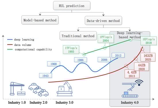 Taking a look at the technical state, it is observed that all key aspects are prepared for adopting deep learning methods for RUL prediction. Currently, we are experiencing the fourth industrial revolution, where accurate RUL prediction is an urgent need. A typical characteristic of “Industry 4.0” is intelligentization, which relies on big data, computational capability, and algorithm models. These three aspects are intertwined and develop together, as shown in Figure 1.