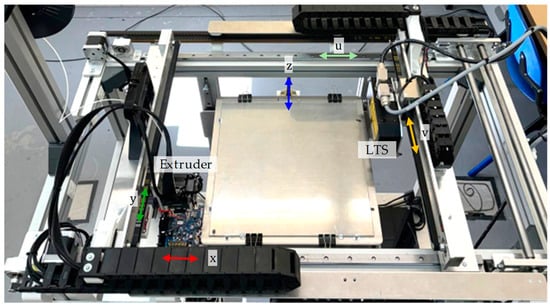 The goal of integrating the LTS into MEX/P equipment is to allow for the full digitization of the target layers, regardless of their position in the workspace. However, some configurations in the consulted literature involve a reduction in effective scanning space due to the integration of the LTS into an existing manufacturing bridge. Other configurations involve external setups that may suffer from occlusion or limited inspection range. A double-bridge MEX/P test bench has been utilized to address these issues. As usual, the extruder head was mounted on the manufacturing bridge, but an additional inspection bridge was designed to accommodate various optical sensors. The mechanical design of the test bench features both bridges sharing common linear guides, ensuring that the XY movement of the extruder and the UV movement of the LTS occur along precisely parallel planes. Both the U and V axes feature micrometric linear encoders for accurate capture of positions eu and ev.