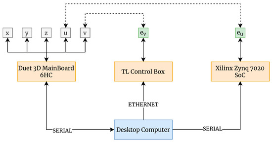 In this case, a PC assumes the role of the master device, with a C++ application controlling the scanning system. This application will establish connections via serial ports to both the Duet3D and the Xilinx SoC. With these modifications, the connection diagram is shown in Figure 2.