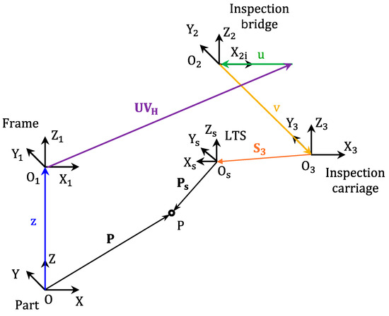Additionally, the movements of the machine axes involved are considered, as well as the possible offsets between them in the machine’s reference or home position (Figure 3). Regarding the mechanical part of the test bench, the kinematic model for extrinsic calibration considers the movement of the machine axes Z, U, and V (ZUV vector), as well as the offset existing between the machine home position of the XYZ axes (manufacturing) and the UV axes (inspection), . As for the LTS sensor, the kinematic model considers the offset between the reference system of this sensor and the carriage on which it is mounted, , as well as a rotation matrix between these two systems, . Thus, Equation (1) shows the extrinsic calibration model.