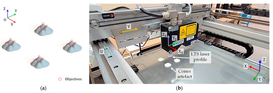 To determine the terms of the extrinsic calibration model, it was decided to use several pairs of conjugate points . Each of these pairs represents the coordinates of a point expressed in both the workpiece reference system , and the sensor reference system , in addition to the values of the setpoints of the ZUV axes at the time of scanning of the respective point. To generate these pairs, similarly to other works [28,44,45], it was chosen to manufacture and digitize an ad-hoc artifact, in this case, composed of several cones of different heights (Figure 4a). These cones were digitized with the LTS recording the coordinates of 16 points, along with the corresponding positions of the ZUV axes at the time of scanning, i.e., z, u, and v, respectively. The coordinates in the workpiece system were extracted from the CAD model of the artifact related to its manufacturing position in the XYZ axes (Figure 4b).