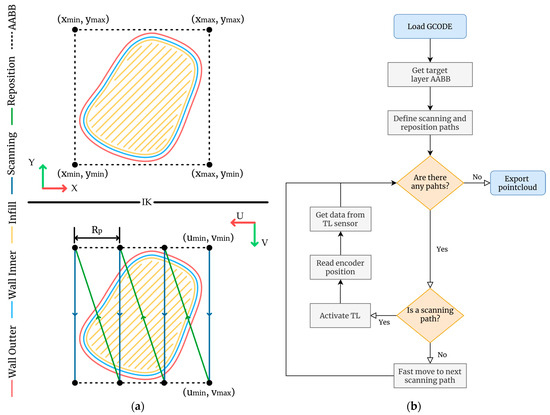 Figure 5. Scanning procedure: (a) definition of scanning and repositioning paths for a generic part. (b) flowchart for target layer data capture. - Offset the AABB to ensure that the layer geometry is contained in the scanning area.