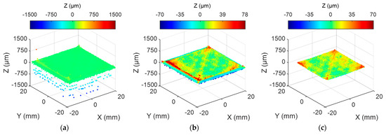 First, points corresponding to layers behind the target layer shall be filtered out. The scanning procedure has already limited the extension of the point cloud to the approximate boundaries of the target layer. Although a reduced portion of points corresponding to lower layers can still be captured, most points effectively correspond to the target layer. Accordingly, an adjustment of the point cloud to a plane by means of the singular value decomposition method, followed by a calculation of the mode for the registered distance of captured points, provides a reference value for the whole target layer. A threshold of 75% of layer height () is thereafter used to extract the relevant information. Then, a new adjustment to a plane is performed, and outliers are filtered using a threshold. A final step is applied to obtain the patch of interest within the digitized surface. Figure 6 contains an example of the pre-processing procedure tailored for the geometry of a square-shaped deposition layer.
