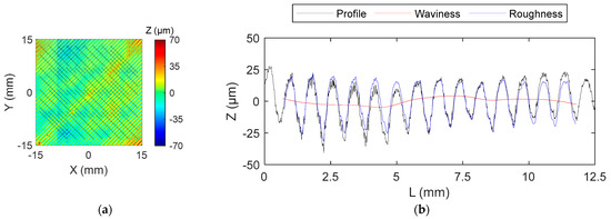 Figure 8a shows the distribution of profiles across the target area, while an example of an extracted profile alongside the superimposition of the correspondent waviness and roughness profiles is presented in Figure 8b.