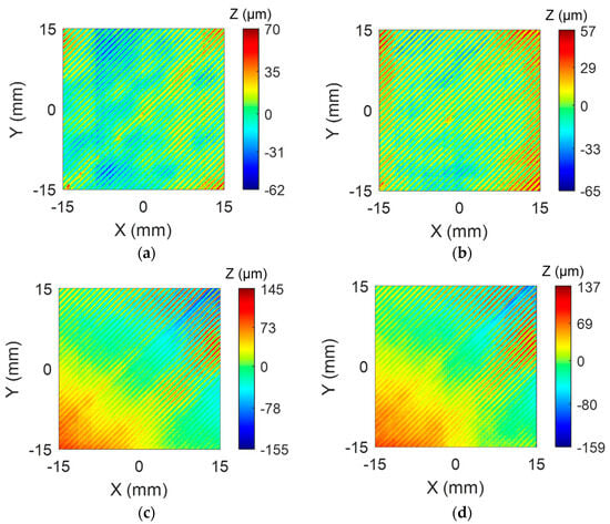 Surface digitizing of test specimens: (a) E1—first replicate; (b) E1—second replicate; (c) E2—first replicate; (d) E2—second replicate.
