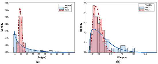 Overall, E2 specimens show higher mean values and a much higher variability for Ra than E1 parts. This indicates that the E2 extruder head produces surfaces with a worse quality in terms of roughness. Regarding Wa, a similar situation has been found, although in this case, both distributions show positive shape values and right tales can be observed in corresponding histograms (Figure 10b). Wa distribution for E2 specimens is stretched with respect to E1; mean values are higher while standard deviation is much higher, indicating that the E2 extruder head also produces surfaces with worse waviness.