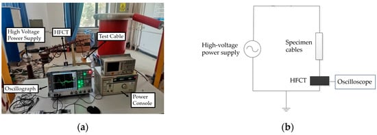 (a) Physical wiring diagram of the high-frequency current partial discharge test platform; (b) schematic diagram of partial discharge detection by the high-frequency current method.