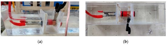 Firstly, a insulation scratch defect was artificially created on the XLPE cable. This was achieved by inserting a 1 mm diameter steel needle into the main insulation of the cross-linked polyethylene to a depth of 1.5 cm and then retracting it, thereby simulating a primary insulation scratch defect model. However, due to the exposure of cable ends to air, they were highly susceptible to surface discharges, rendering it challenging to accurately measure the partial discharge signals of the artificially created defects. Consequently, an experimental apparatus for detecting partial discharge signals in cables, based on insulating oil, was developed. This involved the use of acrylic material to construct a rectangular box with two round holes in the partition at its center, thereby dividing the box into three main compartments. The cable samples were placed in the round holes of the two central dividers, and the apertures were sealed with butyl waterproof adhesive. Insulating oil was then injected at both ends of the box, immersing the cable ends in the oil to prevent surface discharges from occurring. The insulating oil was replaced before each experiment to ensure its superior quality. The setup is illustrated in Figure 2.